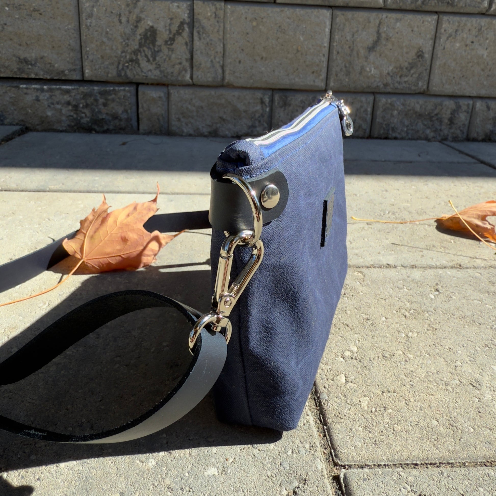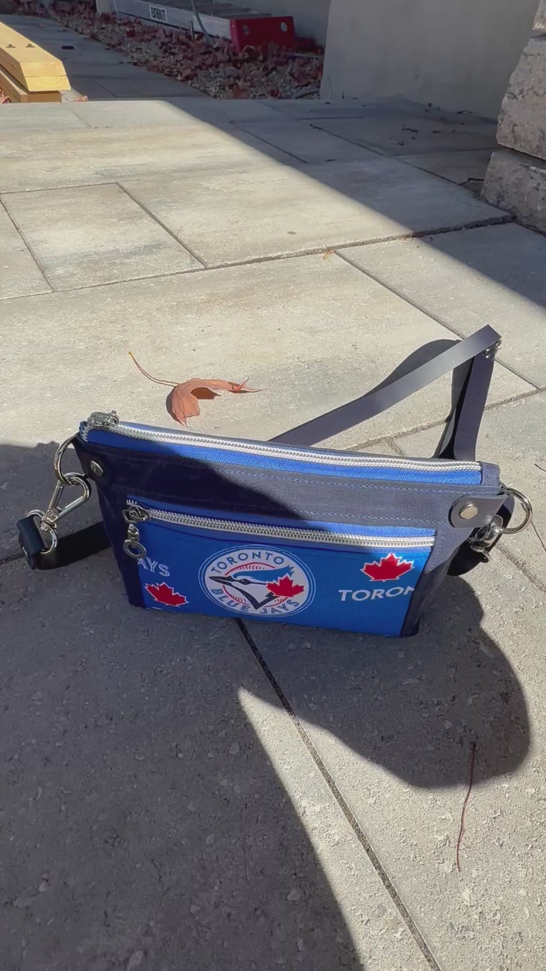 The Devon Crossbody bag is a small bag that nicely fits your phone, a small wallet and a few other things as you go out on the town. This bag has a cotton Toronto team logo fabric paired with navy waxed canvas. It is accented with nickel coloured hardware and navy leather. It includes a 3/4” navy leather crossbody strap extendable to approximately 50”.