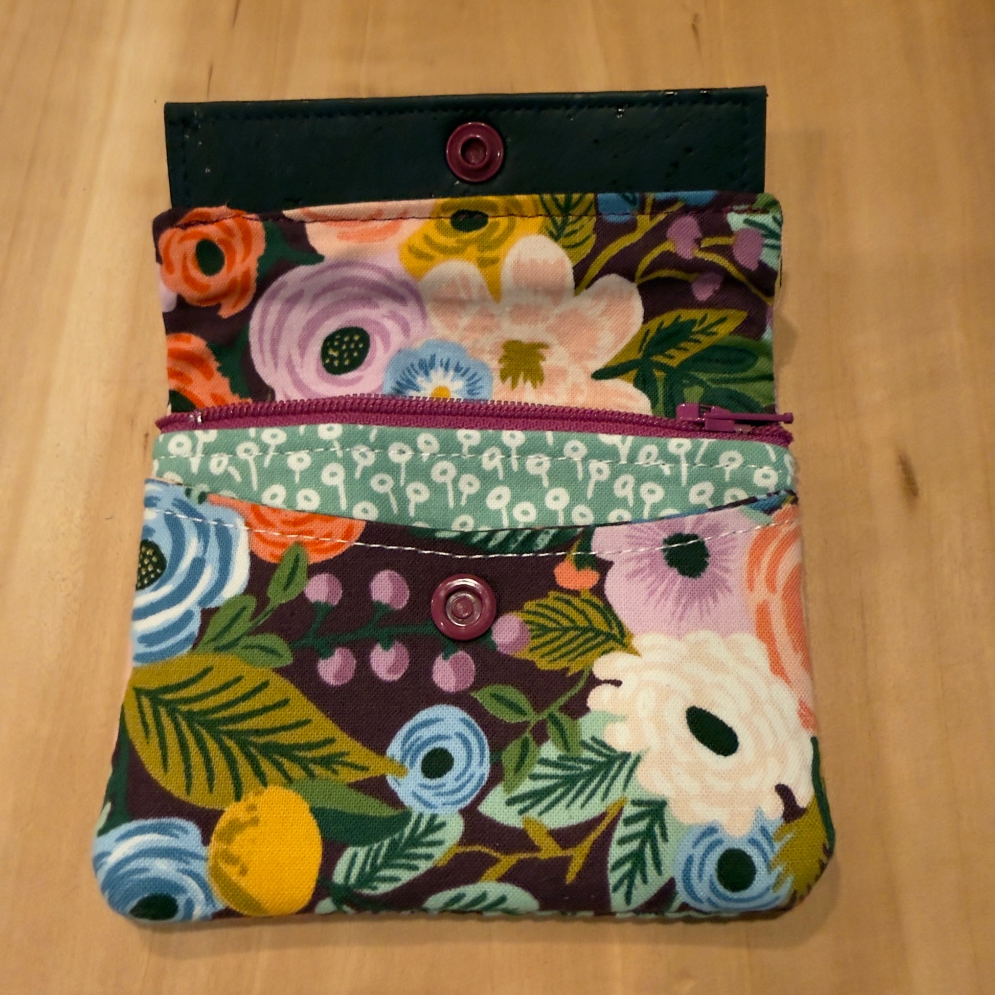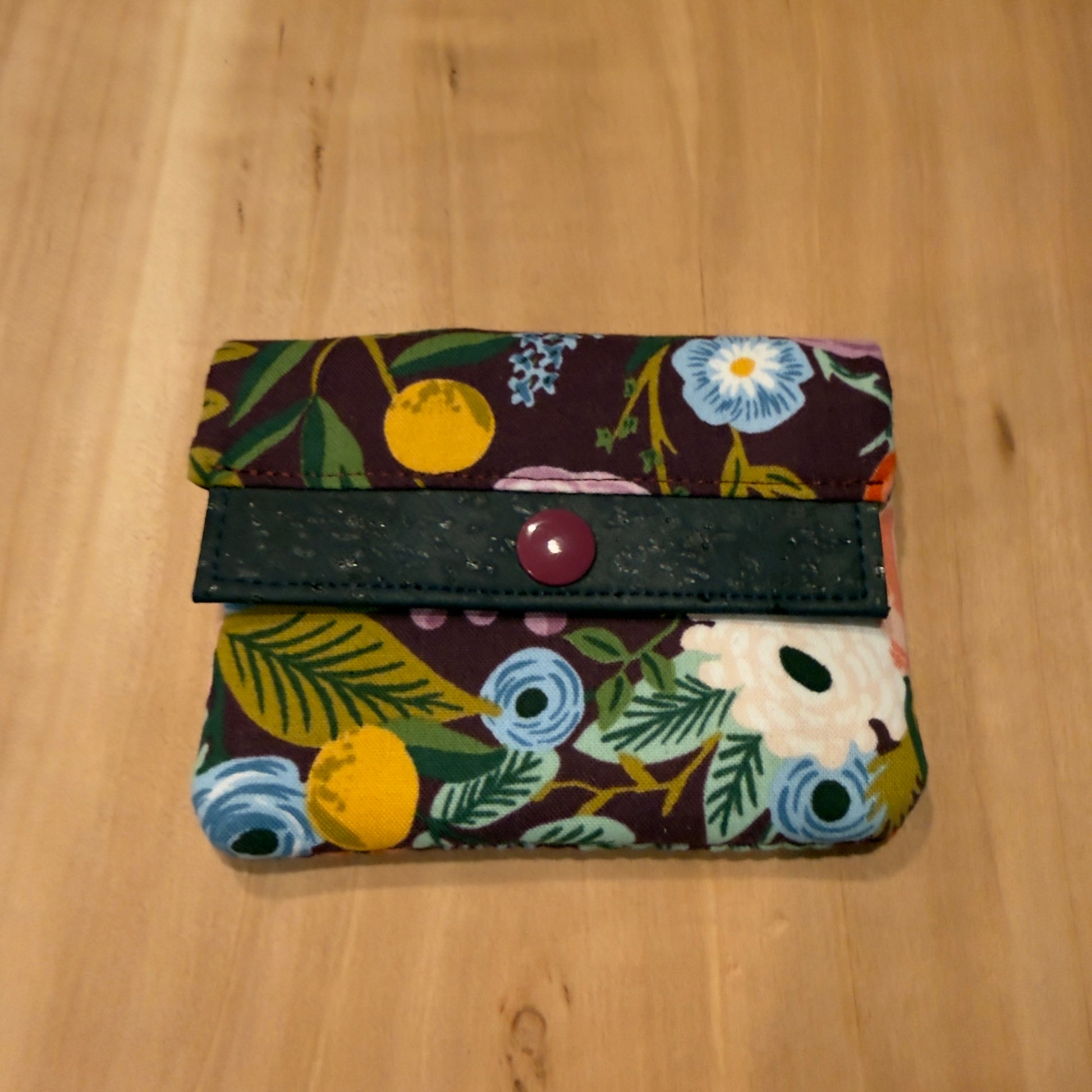 C'est le mini portefeuille parfait, doté de deux emplacements pour cartes ou billets et d'une poche zippée pour la monnaie. Il est fabriqué en toile Rifle Paper & Co pour l'extérieur avec une touche de couleur coordonnée pour la poche zippée. Fermeture à pression.