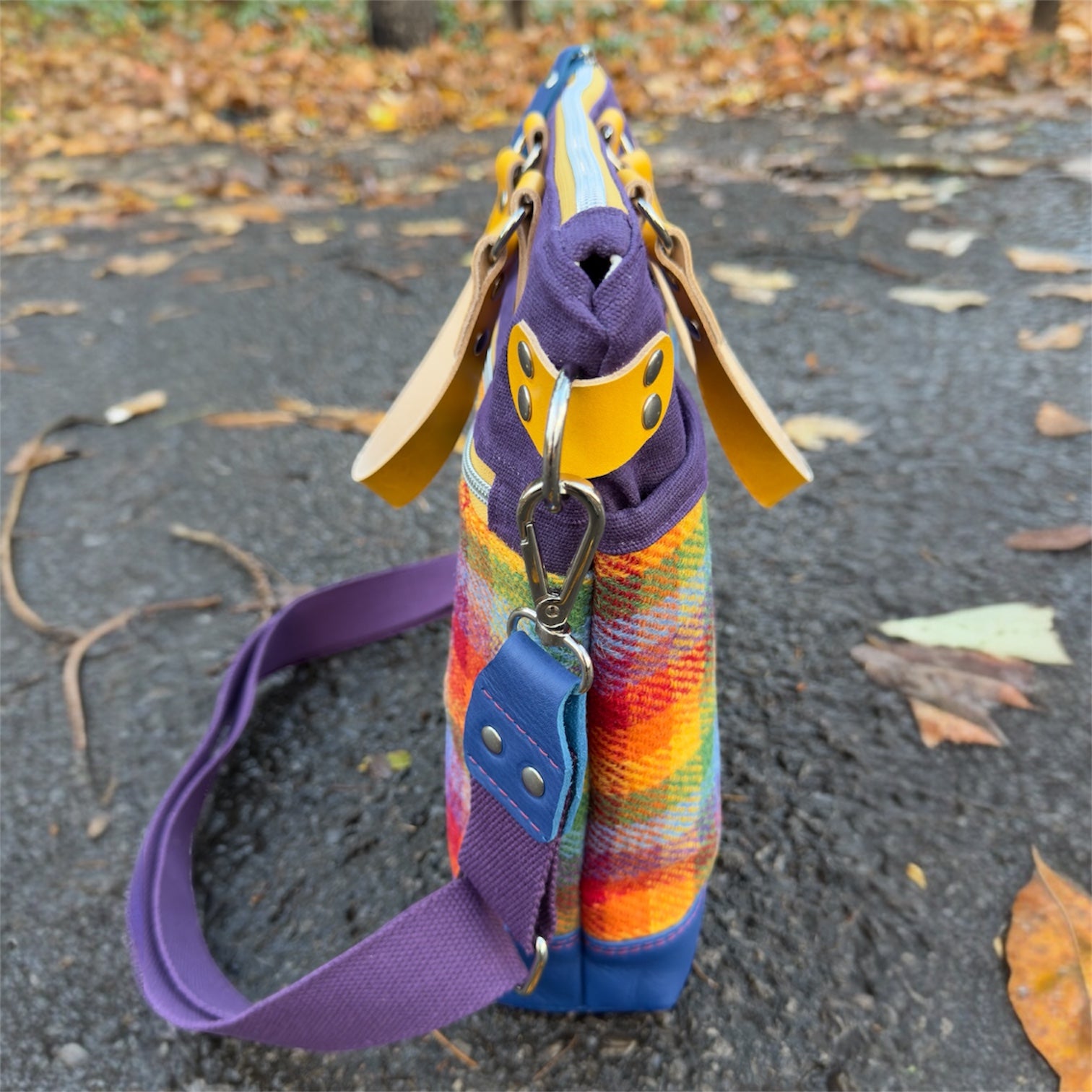 Carry all your items with this stylish and fun tote bag. Being approximately 13” tall, the exterior of the bag is constructed using a beautifully colourful 100% Wool Harris Tweed®. The base of the bag is a royal blue full grained leather with red stitching. The upper portion of the bag is a purple waxed canvas accented with nickel coloured hardware and yellow full grain leather handles. This mix of materials gives a sophisticated and fun look. The interior is constructed of a natural coloured canvas. The strap is 1.5” wide cotton accented with leather.