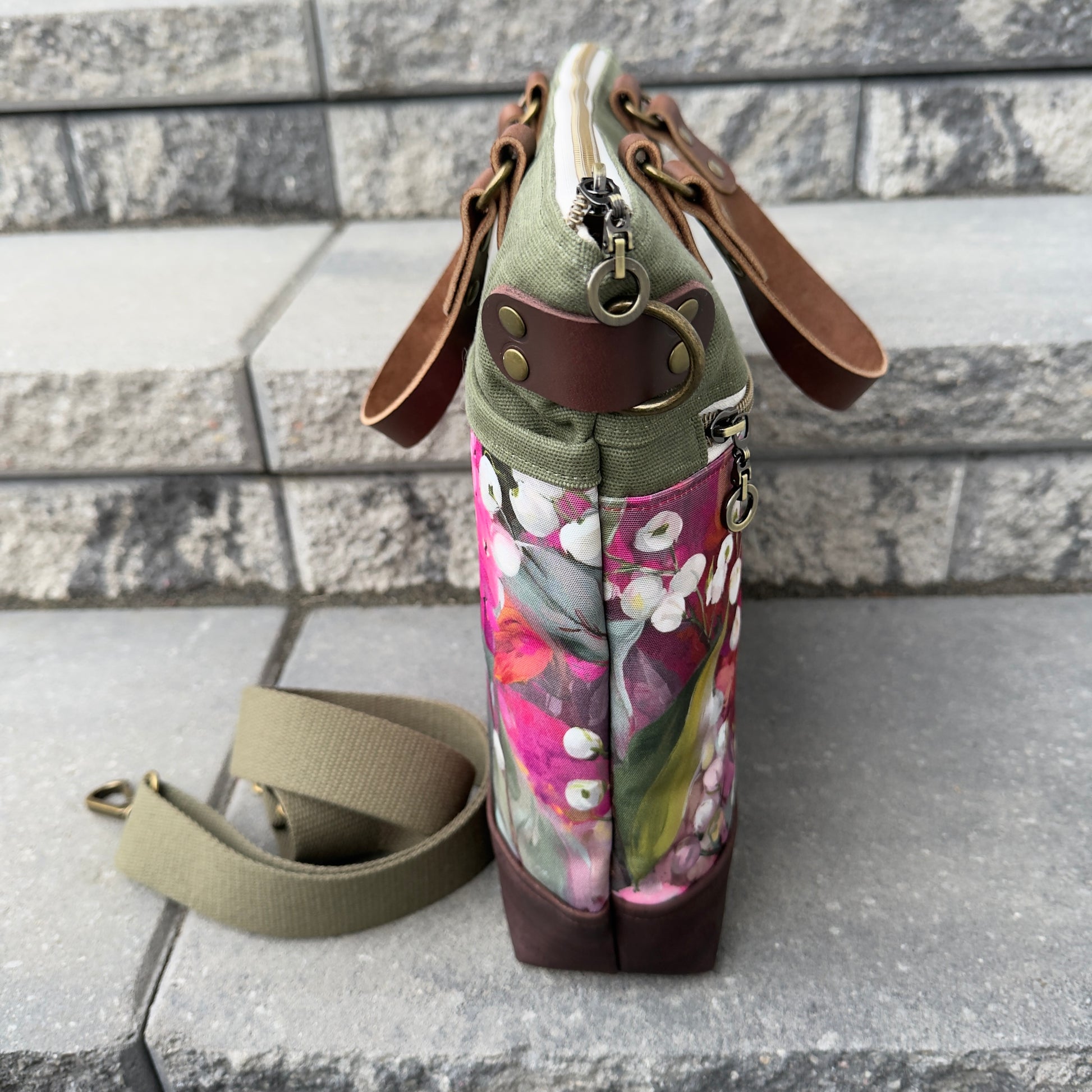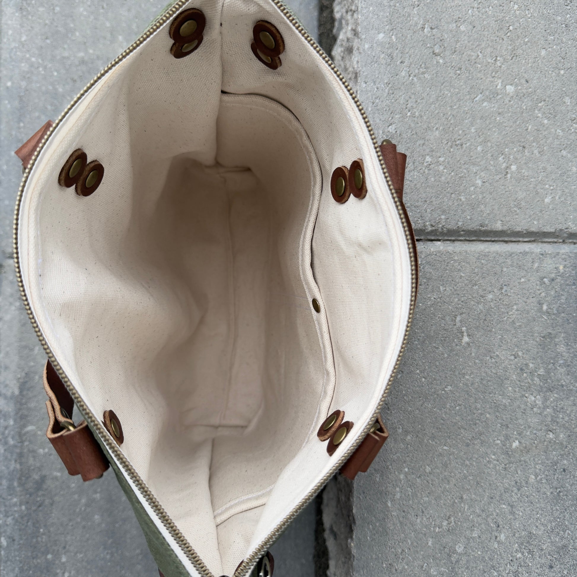 2) Constructed with leaf green waxed canvas and accented with antique bronze coloured hardware.