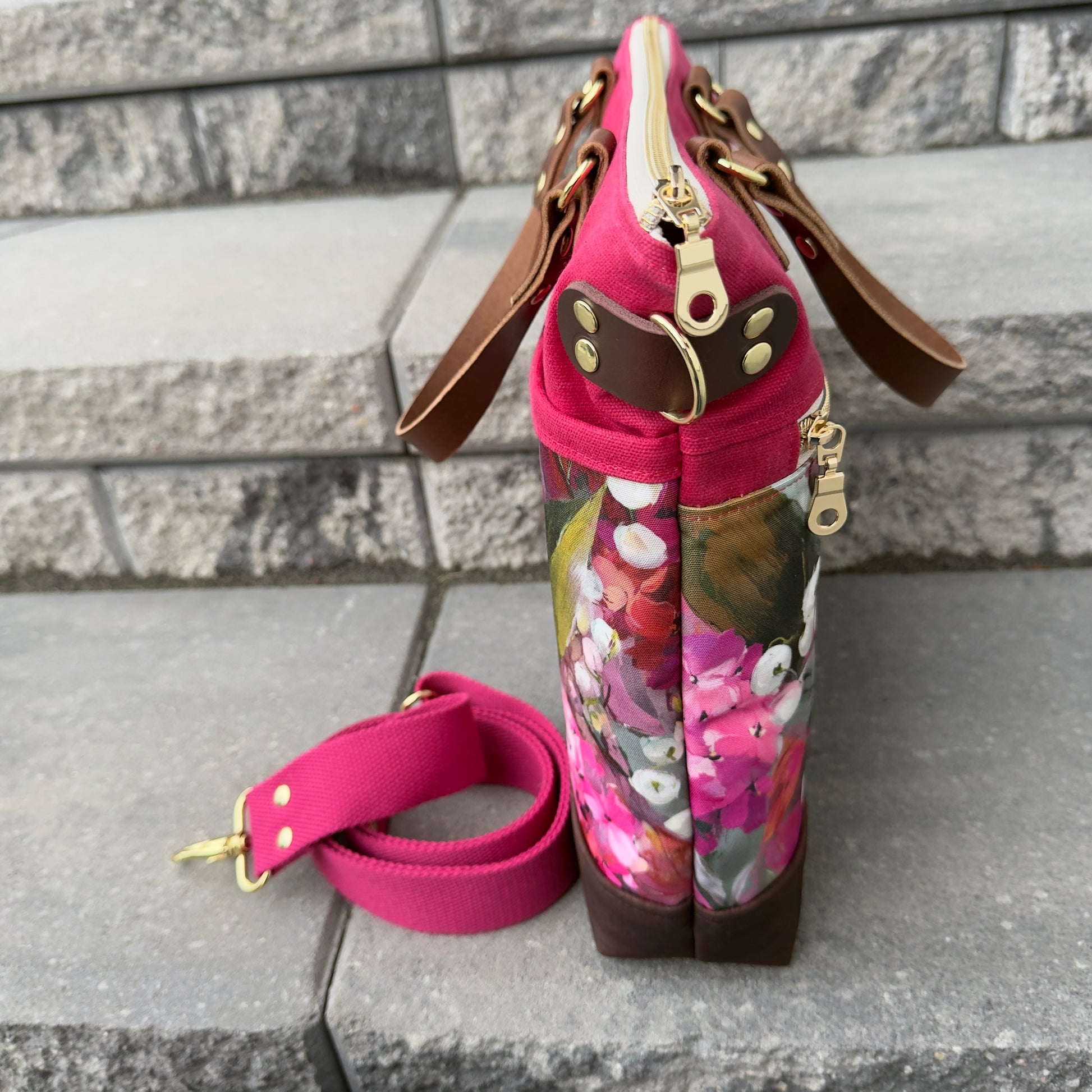 1) Constructed with lipstick pink waxed canvas and accented with gold coloured hardware.